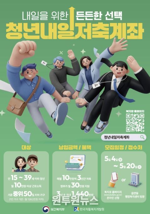 (원투원뉴스) 부천시는 일하는 저소득층 청년의 안정적인 사회 정착과 자산 형성을 지원하기 위해 ‘2026년 청년내일저축계좌’ 신규 가입자를 5월 4일부터 5월 20일까지 모집한다.