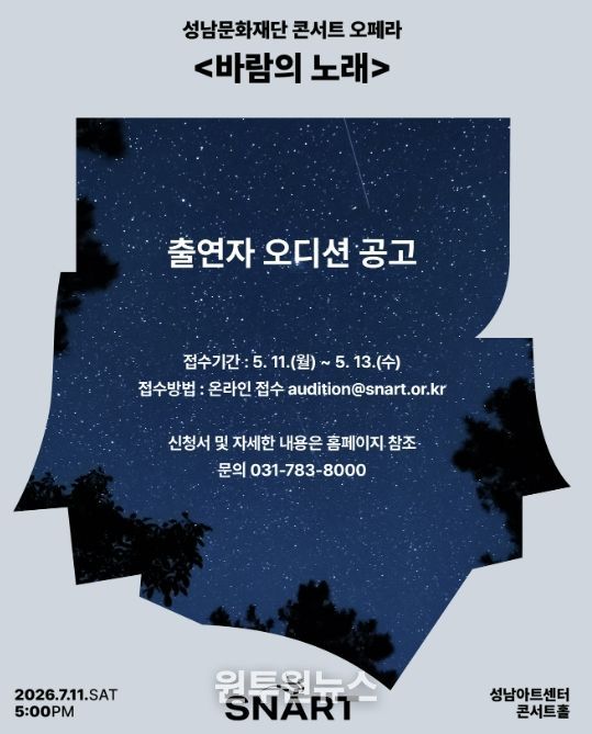 (원투원뉴스) 성남문화재단은 콘서트 오페라 ‘바람의 노래’ 무대를 빛낼 주역 성악가를 선발하는 오디션을 개최한다.