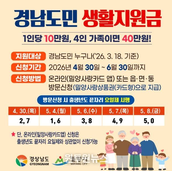 (원투원뉴스) 경남 밀양시는 오는 4월 30일부터 시민 생활 안정을 지원하기 위한 ‘경남도민 생활지원금’ 신청을 받는다고 밝혔다.