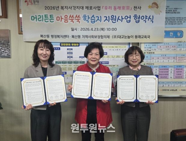 (원투원뉴스) 부산 동래구 복산동 행정복지센터는 지난 23일 복산동지역사회보장협의체, (주)대교눈높이 부산동래교육국과 ‘머리튼튼 마음쑥쑥' 학습지 지원사업 추진을 위한 협약을 체결했다고 밝혔다.