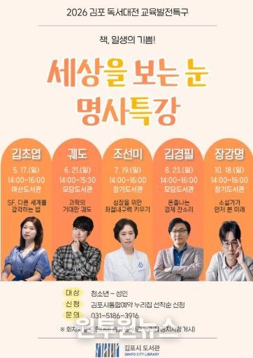 (원투원뉴스) 김포시 도서관은 2026 김포 독서대전 교육발전특구 사업으로 '세상을 보는 눈, 명사특강'을 오는 5월 17일부터 10월 18일까지 5회에 걸쳐 관내 도서관 3곳에서 진행한다.