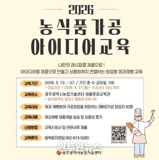 (원투원뉴스) 광주광역시 농업기술센터는 제과·제빵 창업을 희망하는 예비창업자를 대상으로 ‘농식품 가공 아이디어 교육’을 5월 13일부터 27일까지 총 5회 과정으로 운영한다.