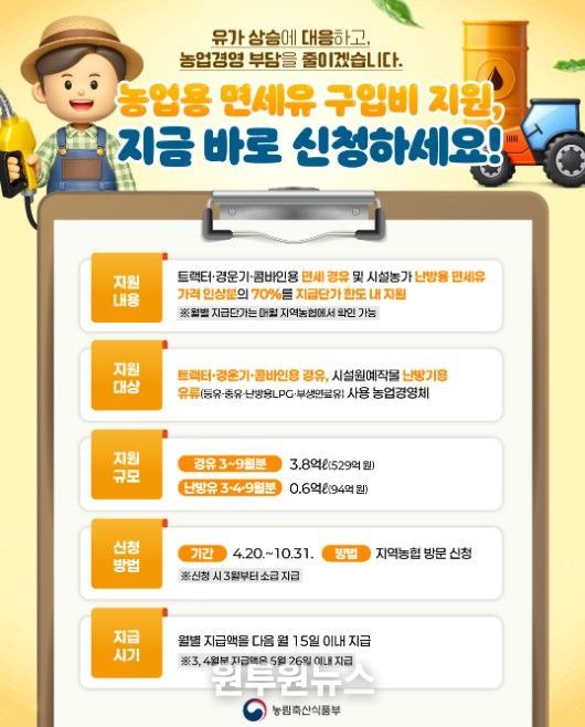 농식품부 윤원습 농업정책관은 “최근 중동전쟁으로 인한 면세유 가격 상승으로 농가의 경영비 부담이 가중됐는데 유가연동보조금이 조금이나마 농가의 숨통을 틔워줄 수 있을 것이라고 생각한다”며, “보다 많은 농업인이 기간 내 신청할 수 있도록 농협의 적극적인 홍보와 농업인의 참여를 당부드린다”고 밝혔다.