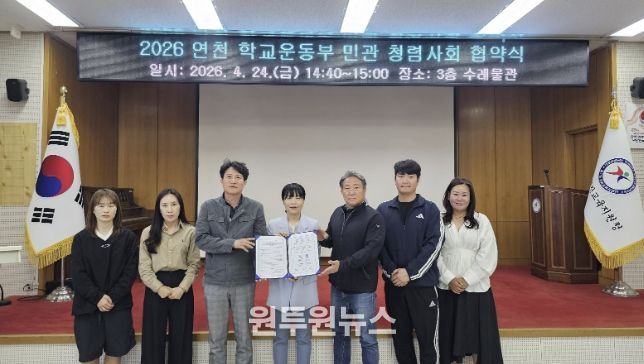 (원투원뉴스) 경기도연천교육지원청은 지난 24일 교육지원청 3층 수레울관에서 연천군청, 연천군체육회, 학교 관계자 및 학부모 대표가 참석한 가운데 ‘2026 연천 학교운동부 투명성 강화를 위한 민·관 청렴사회 협약식 및 학교체육진흥위원회’를 개최했다고 밝혔다.