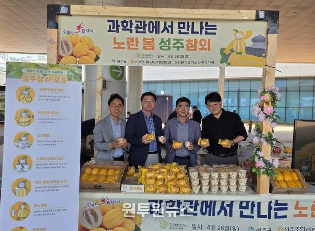 (원투원뉴스) 성주군과 성주조합공동사업법인과 (사)한국참외생산자협의회는 지난 4월 26일, 대구 달성군에 소재한 국립대구과학관에서 과학관에서 만나는 노란 봄 성주참외를 주제로 성주참외 홍보 및 무료 시식 행사를 성황리에 마쳤다.