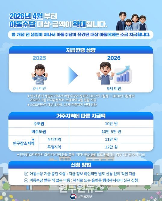 (원투원뉴스) 2026년 4월부터 아동수당 대상·금액이 확대됩니다.