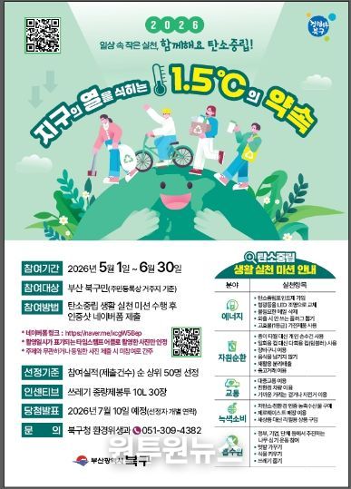 (원투원뉴스) 부산 북구는 오는 5월 1일부터 ‘지구의 열을 식히는 1.5℃의 약속’ 사업을 추진한다고 밝혔다.