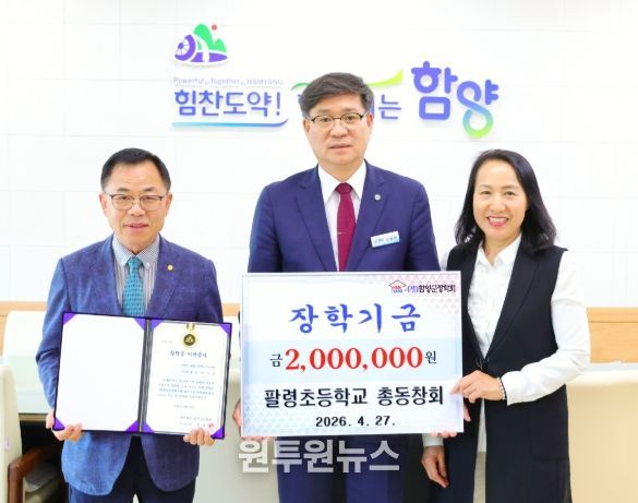(원투원뉴스) (재)함양군장학회는 4월 27일 팔령초등학교 총동창회(회장 박갑열)가 지역 인재 육성을 위한 장학금 200만 원을 기탁했다고 밝혔다.