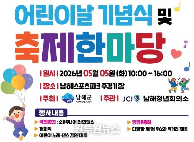 (원투원뉴스) 남해군은 5월 5일 어린이날을 맞아 ‘제104회 어린이날 기념식 및 축제한마당’을 남해스포츠파크 주경기장에서 개최한다.