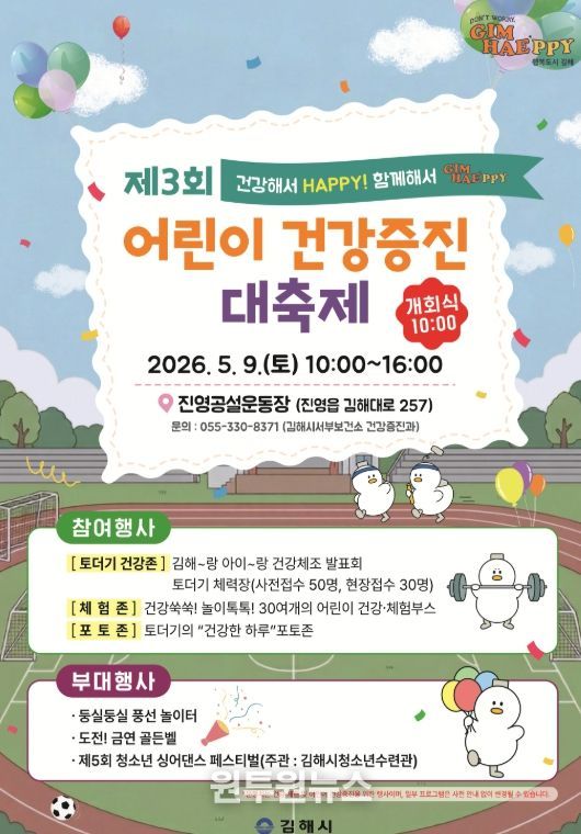 (원투원뉴스) 김해시서부보건소는 오는 5월 9일 진영공설운동장에서 관내 영유아와 초등학생, 가족 등 2,000여 명을 대상으로 ‘제3회 어린이 건강증진대축제’를 개최한다고 밝혔다.