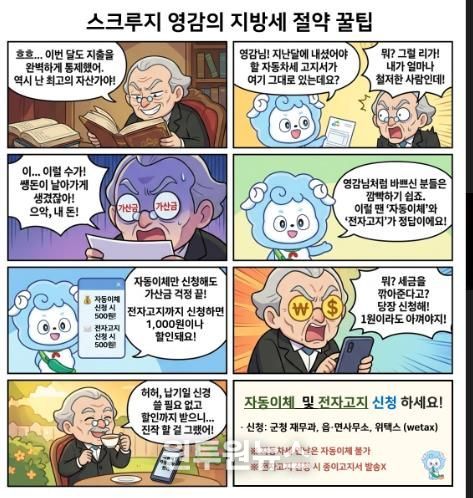 (원투원뉴스) 청양군이 스마트폰 환경에 익숙한 군민들을 위해 친숙한 캐릭터를 활용한 웹툰 ‘스크루지 영감의 지방세 절세 꿀팁’을 제작하고, 자동이체 및 전자고지 신청 독려에 나섰다.