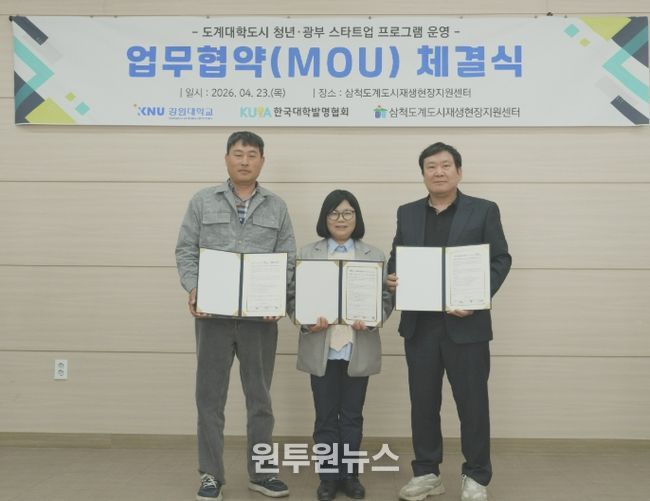 (원투원뉴스) 삼척도계도시재생현장지원센터는 4월 23일 센터에서 강원대학교 도계운영본부, 사단법인 한국대학발명협회와 함께 ‘도계대학도시 청년·광부 스타트업 프로그램 운영’을 위한 업무협약(MOU)을 체결했다.