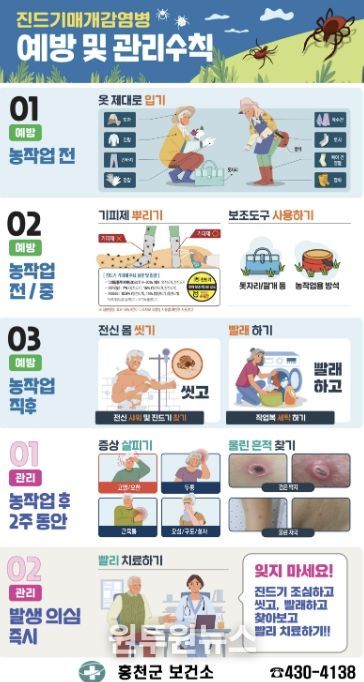 원은숙 홍천군보건소장은 “따뜻해진 날씨로 야외 활동이 늘어나면서 진드기에 노출될 가능성도 높아지고 있다”라며, “농작업과 야외 활동 때 예방 수칙을 꼭 실천하고, 의심 증상이 있으면 즉시 의료기관을 방문해 진료받아 달라”라고 말했다.
