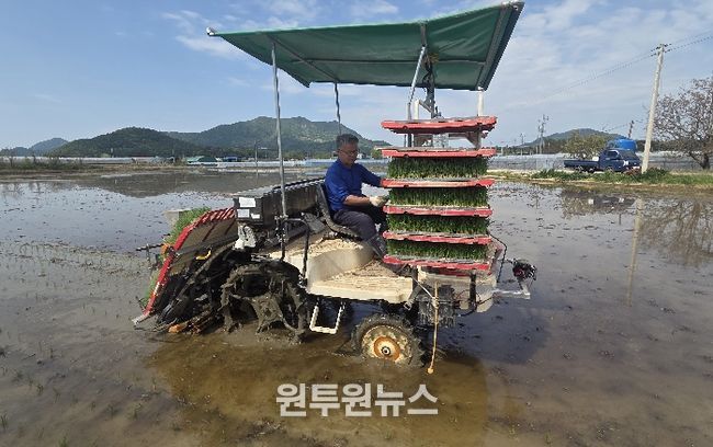 (원투원뉴스) 상주시는 4. 27. 올해 첫 모내기를 실시하는 모서면 도안리 소재 농가의 모내기 현장을 방문하여 올 한해 풍년농사를 이루도록 농업인들을 격려했다.