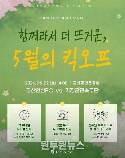 (원투원뉴스) 금산인삼에프씨(FC)는 5월 2일 오후 2시 금산종합운동장에서 기장군민축구단을 상대로 2026 케이(K)4 리그 9라운드 홈경기를 치른다.