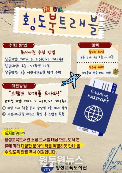 (원투원뉴스) 횡성교육도서관은 5월 6일부터 6월 30일까지 어린이들의 자발적인 독서 습관 형성과 도서관 이용 활성화를 위해 독서 여권을 활용한 ‘횡도북트래블’ 프로그램을 운영한다고 밝혔다.
