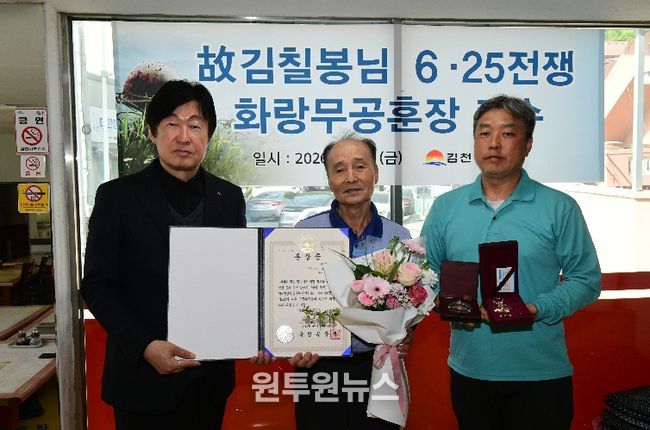 (원투원뉴스) 김천시는 2026년 4월 27일, 故김칠봉님의 유족에게 화랑무공훈장을 전수하는 뜻깊은 행사를 개최했다.
