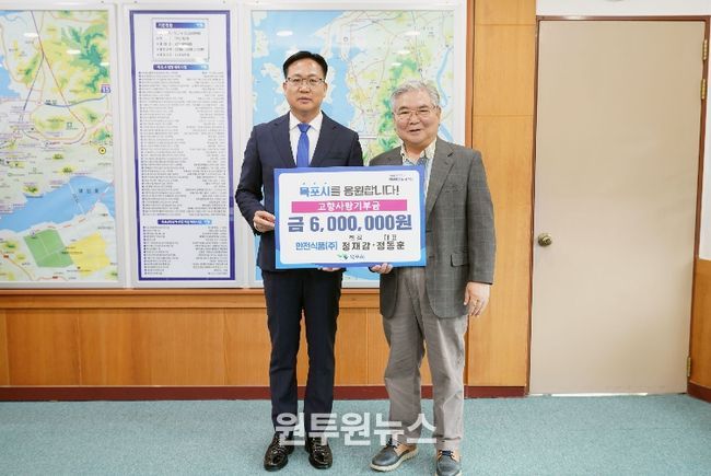 (원투원뉴스) 목포시는 지난 27일 만전식품 정재강 회장이 시를 방문해 고향사랑기부금 600만 원을 기탁했다고 밝혔다.
