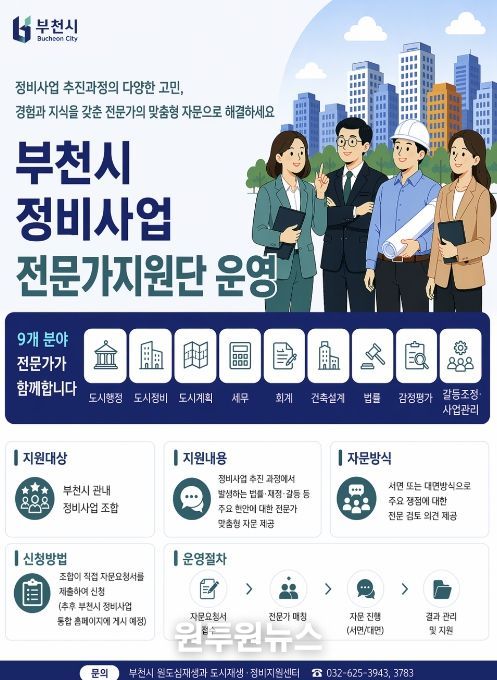 (원투원뉴스) 부천시는 정비사업 추진 과정에서 발생하는 법률·재정·갈등 등 주요 현안에 대한 전문 자문을 지원하기 위해 ‘정비사업 전문가지원단’을 구성해 운영한다고 지난 28일 밝혔다.