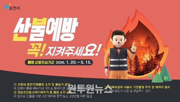 포천시는 시민들에게 영농부산물·쓰레기 불법 소각 금지, 산행 시 라이터·버너 등 화기 소지 및 흡연 금지, 입산통제구역과 등산로 폐쇄 구간 출입 금지 등 산불예방 수칙 준수를 당부했다.
