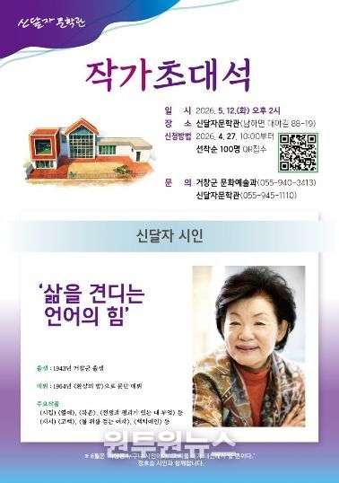 (원투원뉴스) 거창군은 오는 5월 12일 오후 2시 신달자문학관에서 ‘작가초대석’ 강연을 개최한다.