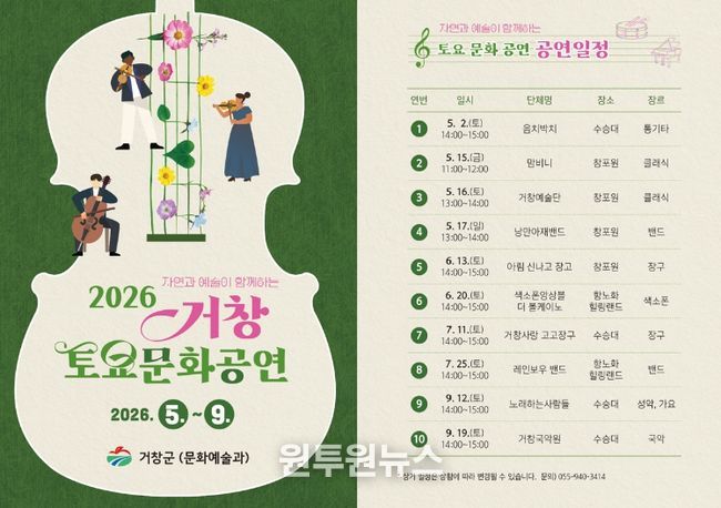 (원투원뉴스) 거창군이 주요 관광지를 무대로 군민과 관광객이 함께 즐길 수 있는 ‘2026 토요문화공연’을 본격 운영한다.