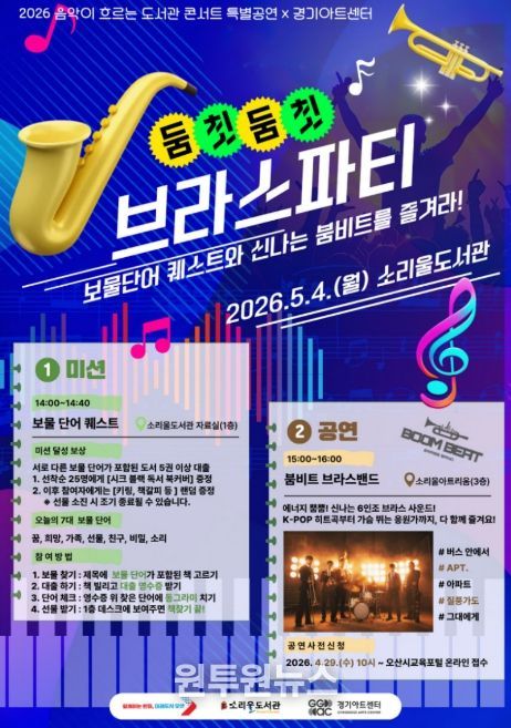 (원투원뉴스) 오산시 소리울도서관은 제104회 어린이날을 앞둔 오는 5월 4일 경기아트센터와 협업해 ‘2026 음악이 흐르는 도서관 콘서트’ 특별공연인 ‘둠칫둠칫 브라스 파티’를 개최한다고 밝혔다.