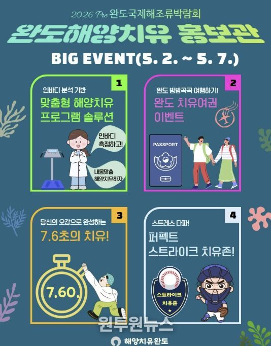 (원투원뉴스) ‘2026 Pre 완도국제해조류박람회’ 개최 기간(5.2~5.7) 동안 완도만의 해양치유 콘텐츠를 선보이는 ‘해양치유 홍보관’을 운영한다.
