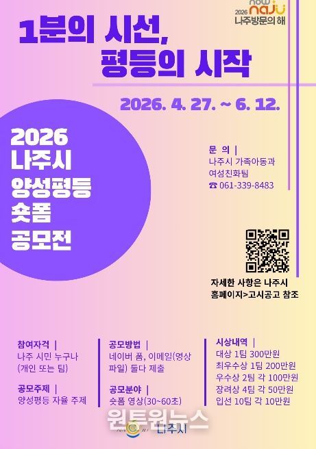 (원투원뉴스) 전남 나주시가 양성평등 문화 확산을 위해 시민이 직접 참여하는 숏폼 영상 공모전을 개최하고 일상 속 평등 가치 확산에 나선다.