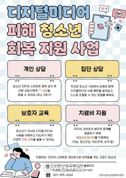 (원투원뉴스) 고양시청소년재단 산하 고양시청소년상담복지센터는 디지털 유해환경에 의한 청소년의 디지털 과의존 및 사이버 도박 등의 사회문제를 예방하고 치료하기 위해 오는 5월부터 12월까지 ‘디지털미디어 피해 청소년 회복 지원 사업’을 운영한다고 밝혔다.