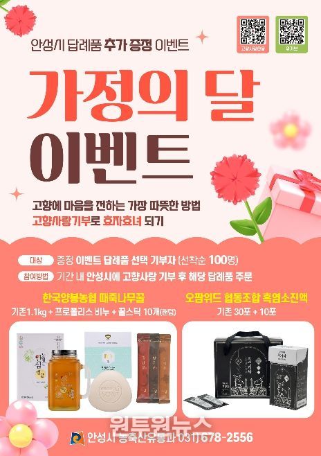 (원투원뉴스) 안성시는 오이데이와 5월 가정의 달을 맞아 고향사랑기부제 참여 확대와 지역 농산물 소비 촉진을 위해 ‘오이데이 이벤트’와 ‘가정의 달 이벤트’를 추진한다고 밝혔다.