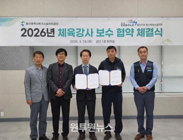 (원투원뉴스) 울산광역시북구시설관리공단과 전국공공운수사회서비스노동조합 울산지부 울산체육시설지회는 28일 공단 1층 회의실에서 체육강사들의 처우 개선과 상생 협력을 위한 ‘2026년 체육강사 보수 협약 체결식’을 개최했다,