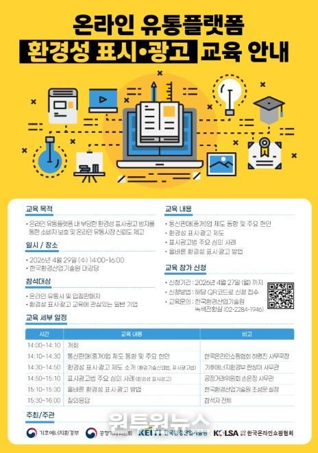 (원투원뉴스) 공정거래위원회와 기후에너지환경부는 4월 29일 한국환경산업기술원 대강당(서울 은평구 소재)에서 온라인 유통사를 대상으로 ‘환경성 표시·광고 교육’을 개최한다고 밝혔다.