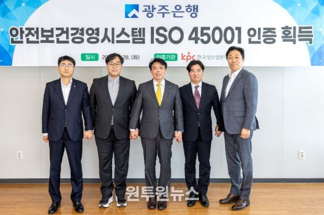 (원투원뉴스) 광주은행(은행장 정일선)은 28일 광주은행 본점에서 정일선 광주은행장과 강장진 한국생산성본부인증원장 및 주요 관계자들이 참석한 가운데, 안전보건경영시스템 국제표준인 ‘ISO 45001’ 인증 수여식을 개최했다고 밝혔다.