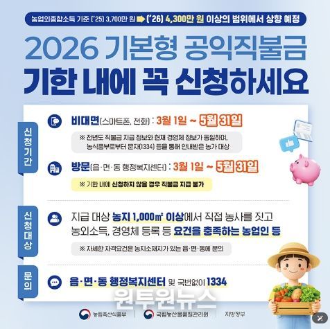 (원투원뉴스) 2026 기본형 공익직불금 기한 내에 꼭 신청하세요.