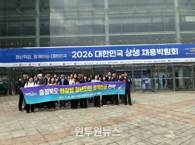 (원투원뉴스) 충북도는 28일 도내 현장형 청년인턴 34명을 대상으로 서울 aT센터에서 열린 ‘2026 대한민국 상생 채용박람회’에서 정책현장견학을 실시했다.