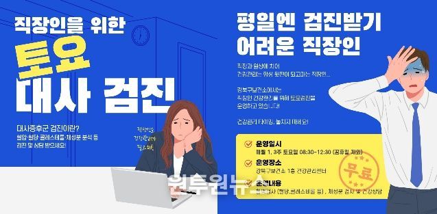 (원투원뉴스) 서울 강북구 보건소 건강관리센터가 평일에 시간을 내기 어려운 직장인들의 건강 회복을 위해 ‘직장인 맞춤형 토요 대사증후군 검진 서비스’를 운영하며 구민 건강권 확보에 나섰다.