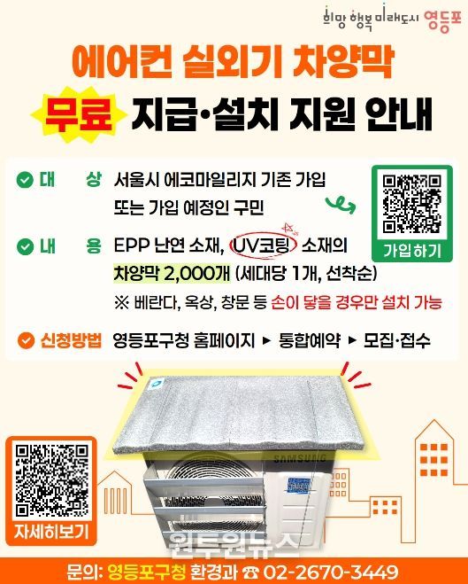 (원투원뉴스) 영등포구가 다가오는 여름철 무더위에 대비해 구민들의 냉방비 부담을 줄이고 에너지 효율을 높이기 위한 ‘에어컨 실외기 차양막 설치 지원사업’을 추진한다고 밝혔다.