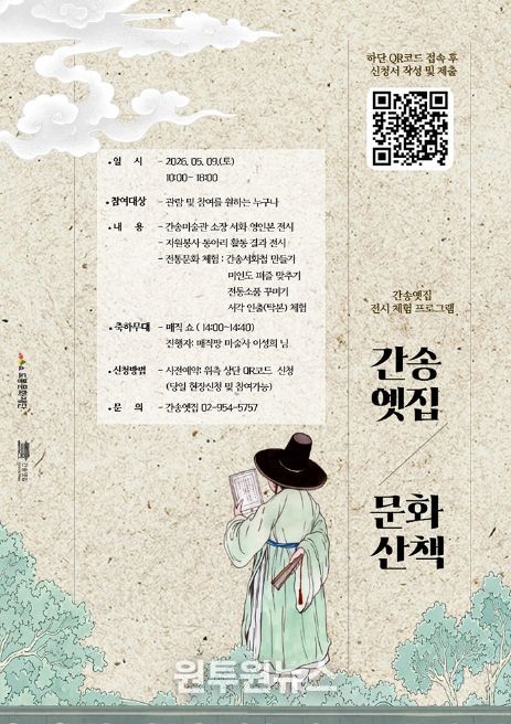 (원투원뉴스) 서울 도봉구 도봉문화재단 간송옛집이 오는 5월 9일 오전 10시부터 간송옛집에서 전시·체험·공연이 결합한 참여형 문화프로그램 ‘간송옛집 26년도 문화산책’을 진행한다.