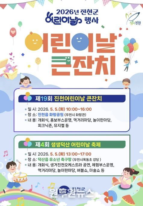 (원투원뉴스) 충북 진천군은 제104회 어린이날을 맞아 5월 5일 진천읍 화랑공원과 덕산읍 유소년축구장 두 곳에서 어린이날 기념행사를 개최한다고 밝혔다.