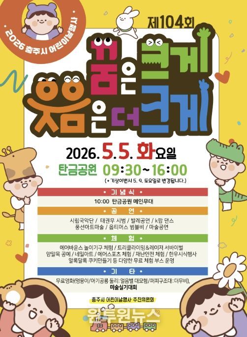 (원투원뉴스) 충주시는 오는 5월 5일 오전 9시 30분부터 탄금공원에서 ‘제104회 어린이날’을 기념하는 ‘2026 어린이날 행사’를 개최한다고 밝혔다.