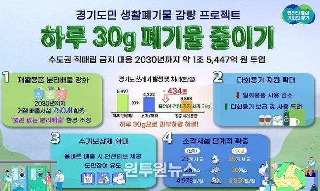 (원투원뉴스) 수도권 직매립 금지에 따른 생활쓰레기 감량을 위해 경기도가 2030년까지 5년간 약 1조 5,447억 원을 투입하는 ‘하루 30g, 도민실천형 생활폐기물 감량 프로젝트’를 추진한다.