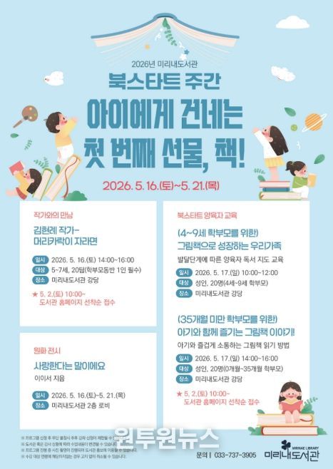 (원투원뉴스) 원주시 미리내도서관은 다음 달 16일부터 21일까지 북스타트코리아와 함께 ‘아이에게 건네는 첫 번째 선물, 책!’을 주제로 북스타트 주간 프로그램을 운영한다.
