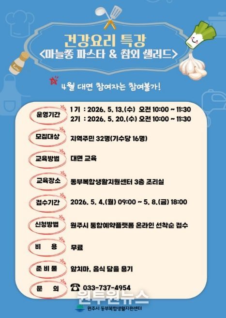 (원투원뉴스) 원주시 동부복합생활지원센터는 다음 달 4일부터 ‘마늘쫑 파스타·참외 샐러드 만들기’ 건강 요리 특강 프로그램 참여자를 모집한다.