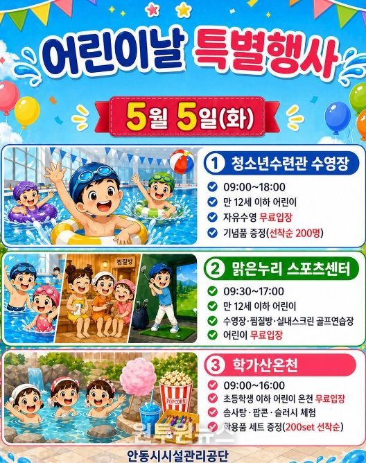 (원투원뉴스) 안동시시설관리공단은 제104회 어린이날을 맞아, 오는 5월 5일 공단이 운영하는 주요 공공시설 3곳을 어린이와 가족들을 위해 무료로 개방하고 다채로운 체험행사를 운영한다고 밝혔다.