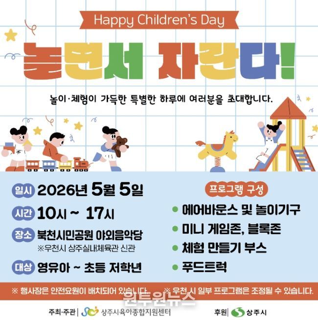 (원투원뉴스) 상주시는 제104회 어린이날을 맞아 오는 5월 5일 북천시민공원 야외음악당에서 ‘Happy Children`s Day – 놀면서 자란다!’를 주제로 어린이날 기념행사를 개최한다.