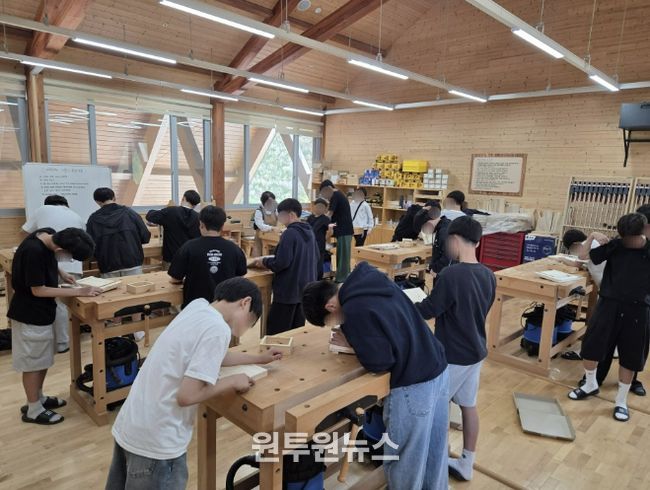 (원투원뉴스) 상주시 성주봉자연휴양림의 상주목재문화체험장과 힐링센터에서는 지난 4월 27일 안동경덕중학교 학생들 150여명을 대상으로 목재문화체험장과 힐링센터에서 독서대 만들기 체험과 숲 해설 체험을 진행했다.