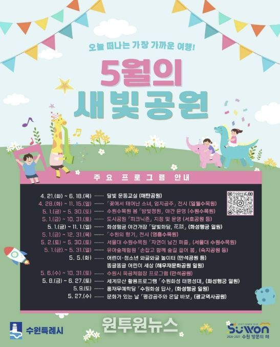 수원시 관계자는 “가정의 달 5월을 맞아 시민들이 가까운 공원에서 자연과 문화를 함께 즐길 수 있도록 다양한 프로그램을 준비했다”며 “전 세대가 함께 누릴 수 있는 공원 중심 문화 콘텐츠를 확대해 나가겠다”고 말했다.