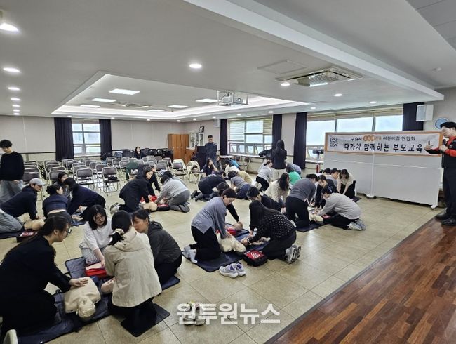 28일 한국자유총연맹 수원지부에서 0세아전용어린이집 학부모를 대상으로 심폐소생술 실습과 응급상황 대응 방법 교육을 했다.