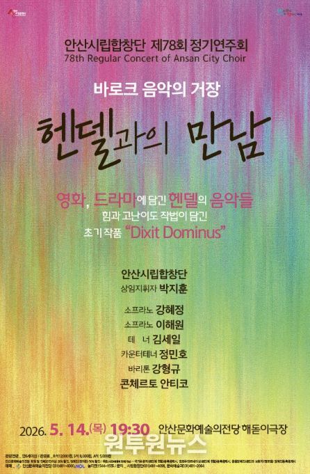 (원투원뉴스) 안산시는 내달 14일 오후 7시 30분 안산문화예술의전당 해돋이극장에서 안산시립합창단 제78회 정기연주회 '헨델과의 만남'을 개최한다고 29일 밝혔다.